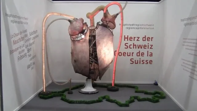 Das organische Herz steht in Bern, pulsiert und speist durch seine Blutbahnen die Städte Zürich, Basel, Genf. Start durch Push-button, ausgelöst durch Besucher.